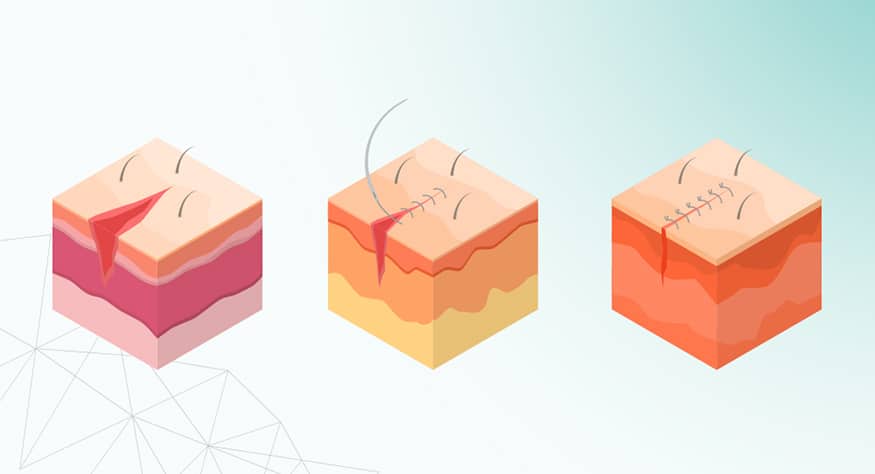 Surgical wounds typically heal by primary intention or closure using sutures. Good pre-and-post-operative wound management is recommended. Sutures and staples should be left in place for an adequate amount of time to establish wound closure; sutures in place for an extended period may pose risk for scarring and infection.6 All surgical wounds require a moist wound environment to support healing.7 Evidence suggest that use of negative pressure wound therapy (NPWT) may be beneficial for patients with non-healing surgical wounds.8 For patients at risk of malnutrition, nutritional supplementation should be considered.