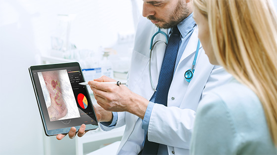 Reduce wound measurement and document time to minutes. Our image assessment is simplified to point and click. Simply circle around the wound and mark the wound to compute wound dimensions and color composition. With easy-to-use tools, you can simply include additional wounds or exclude regions such as tendon or bone based on clinical observation. Through a user guided process, our application ensures consistency and accuracy. See how it works!